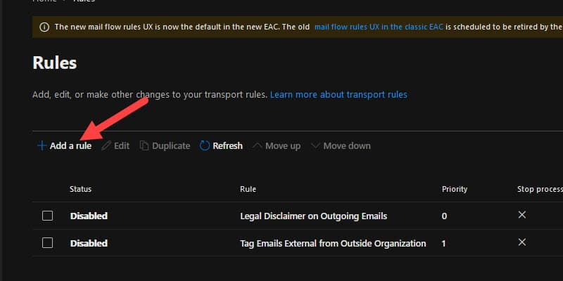 Go to Mail Flow, then Rules. Click on Add a Rule then Create a new rule.