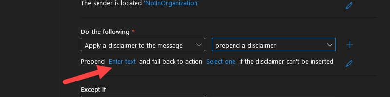 Do the following – select apply a disclaimer to the message and then select prepend a disclaimer. Click on enter text.