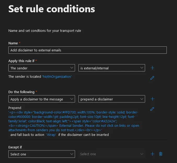 In this first example, I’ll create an email disclaimer rule that applies to all emails received from an external sender (outside the organization). This data is taken from this link
