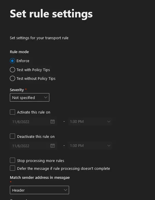 The Rule Settings. Place in the priority that you want it to be in your transport rules list. The Rule mode should be Enforce. Make sure you don’t choose to stop processing more rules.