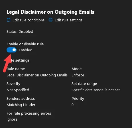 Name – Give the rule a descriptive name. For example, Add disclaimer to external emails.