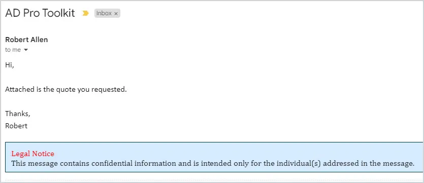 For this example, we are going to apply a simple legal disclaimer on ALL outgoing messages. Appending a disclaimer will put it at the bottom of the email like the picture below.