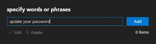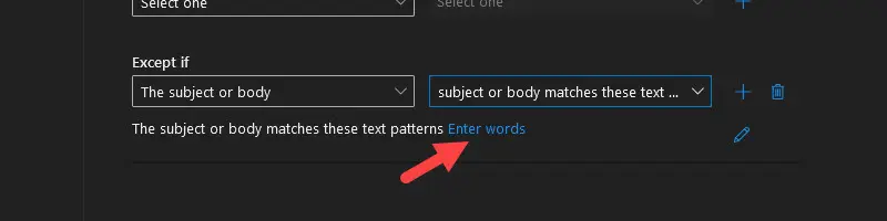 Under the And, select The subject or body and then select subject or body matches these text patterns. As an example, we are going to apply this rule if we get a lot of phishing emails that say “Update your password”. To specify this, click on Enter words.
