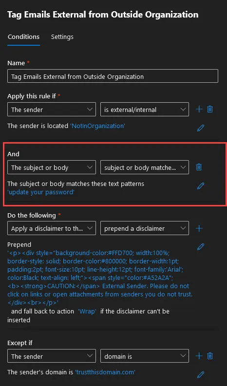 Now your rule would look like below. This will apply the disclaimer to all emails sent from outside the organization that has the phrase update your password but will not apply the Tag when sending to the domain trustthisdomain.com.