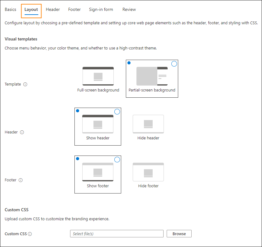 - Template – choose the one of the two built-in sign-in page layouts. If you want to put your background image in the limelight, select Partial-screen background.