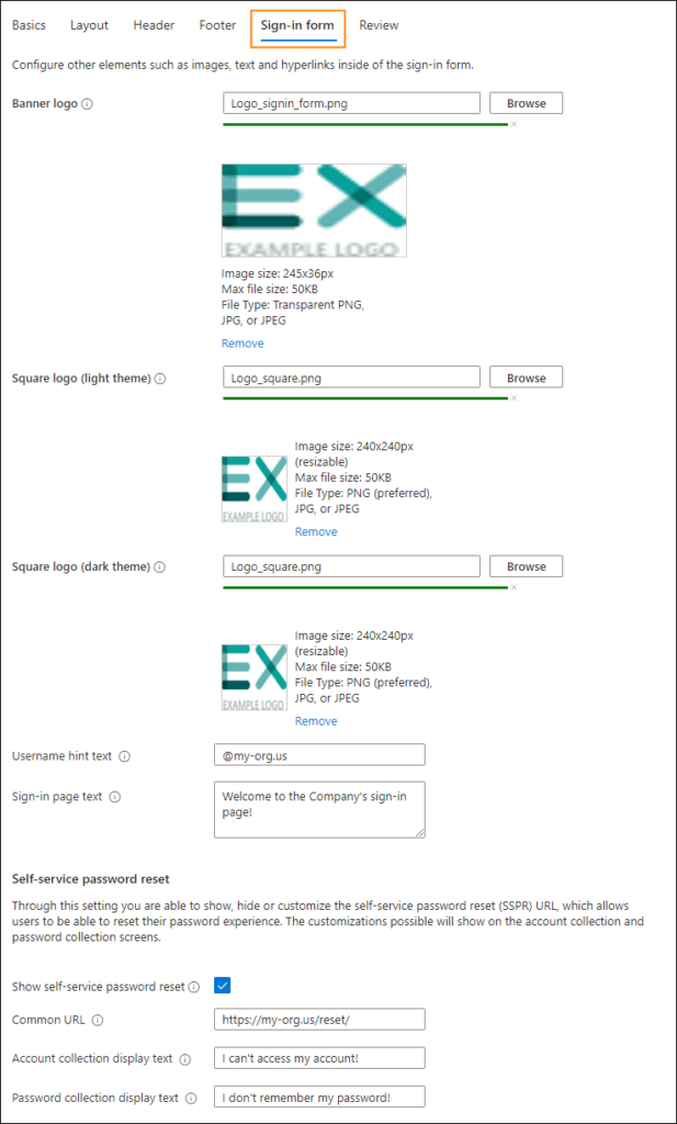 - Banner logo – here you can add your company’s logo that’s going to appear on top of the sign-in box. You’ll need a 245x36px PNG, JPG or JPEG image with a maximum file size of 50KB.