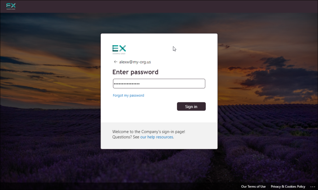 - Sign-in page text – this text is shown below the text box where an end user provides their credentials. It can be, for example, a welcome message for any user that signs in to your Microsoft 365 services.
