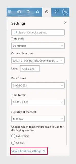 Open your Outlook calendar and click on the cog icon in the top right corner. Then click “View all Outlook settings” at the bottom.