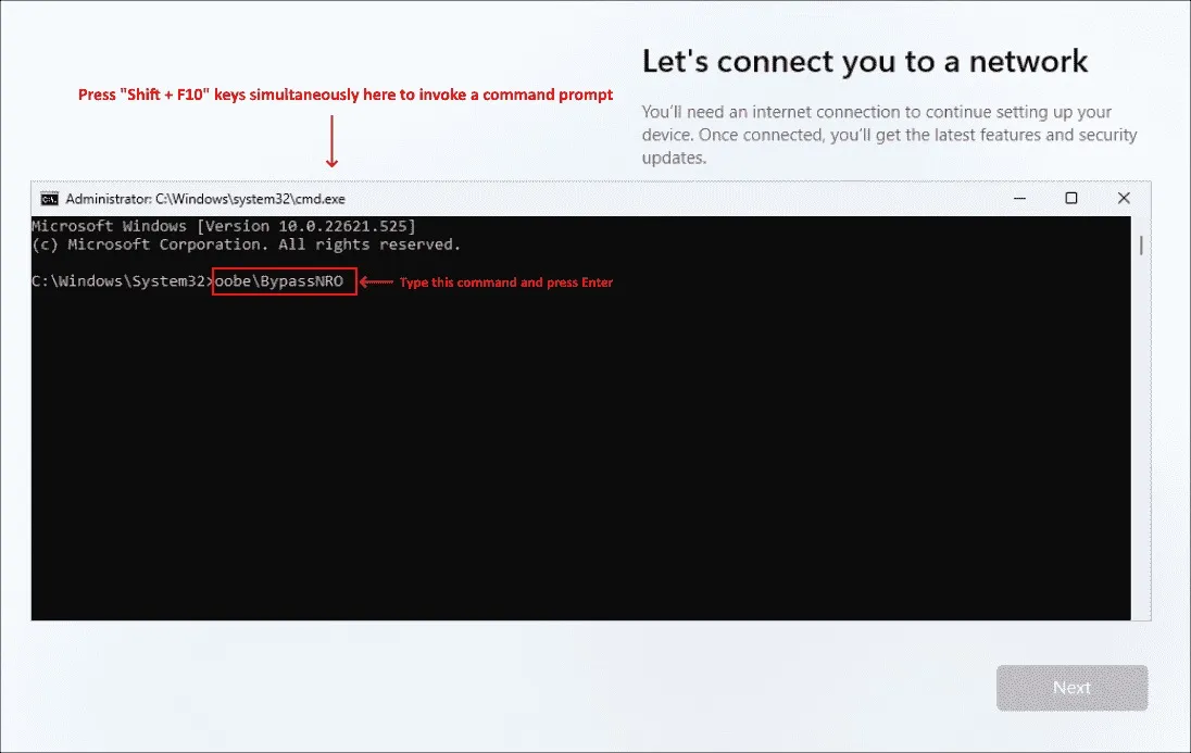 3. In the command prompt, run the following command: oobe\BypassNRO