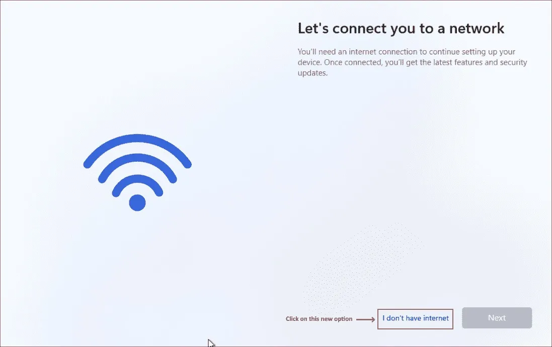6. After the restart, you will again be prompted to select your region and keyboard layout. However, this time, on the Let’s connect you to a network screen, you will notice a new option: I don’t have internet.