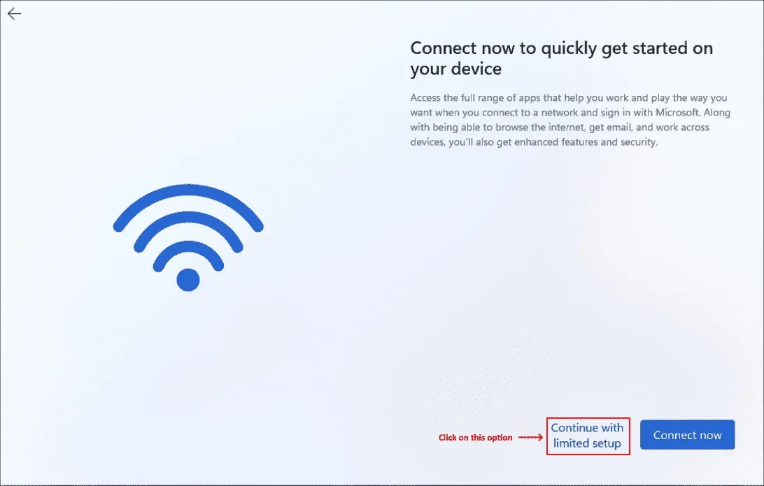 7. Select I don’t have internet option, and then select Continue with limited setup.