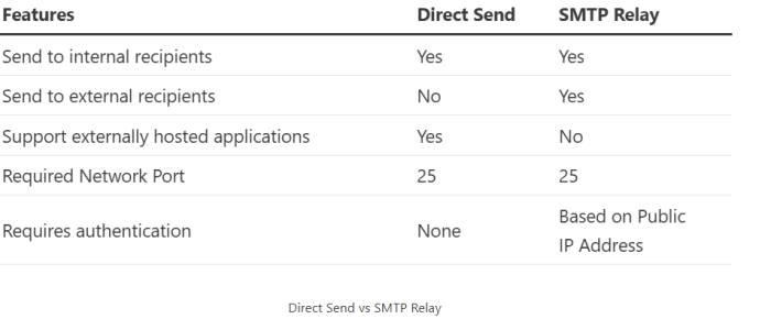 SMTP Relay on the other hand can be used to send emails directly to external contacts, but only from networks (public IP addresses) that you have defined.