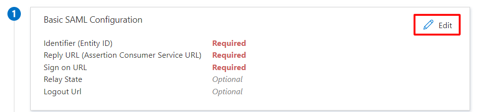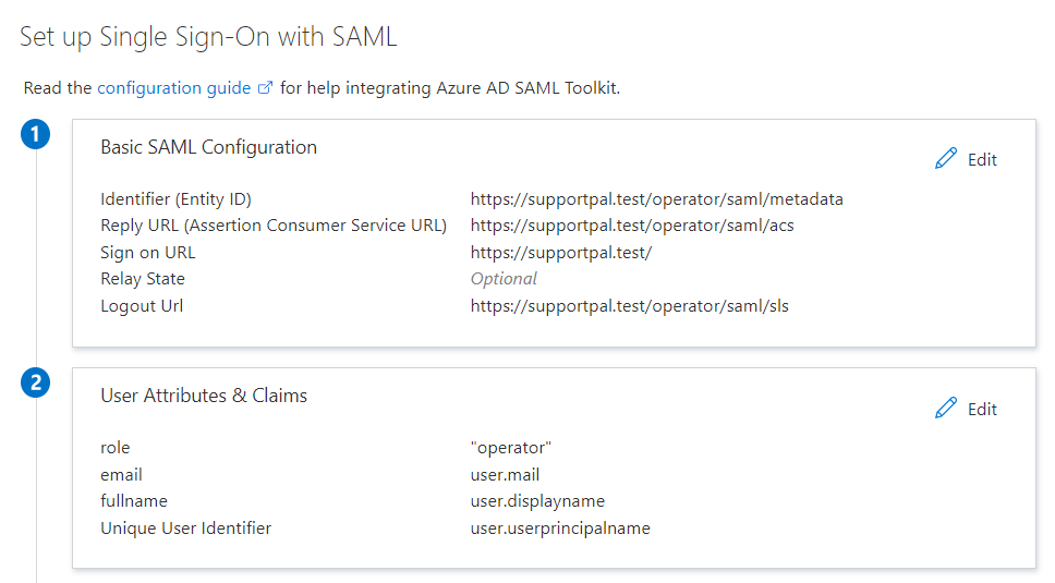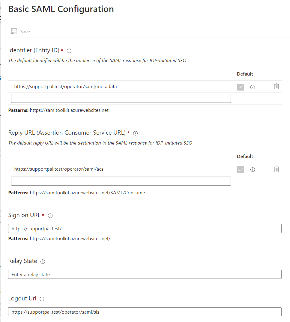 8. Click 'Edit' in the Basic SAML Configuration area. Set the text boxes like shown and set the relevant options as default, replacing the start of the URL with your help desk URL. To use this on the frontend (for users), replace 'operator' with 'frontend'. Click 'Save' once all the fields have been set.