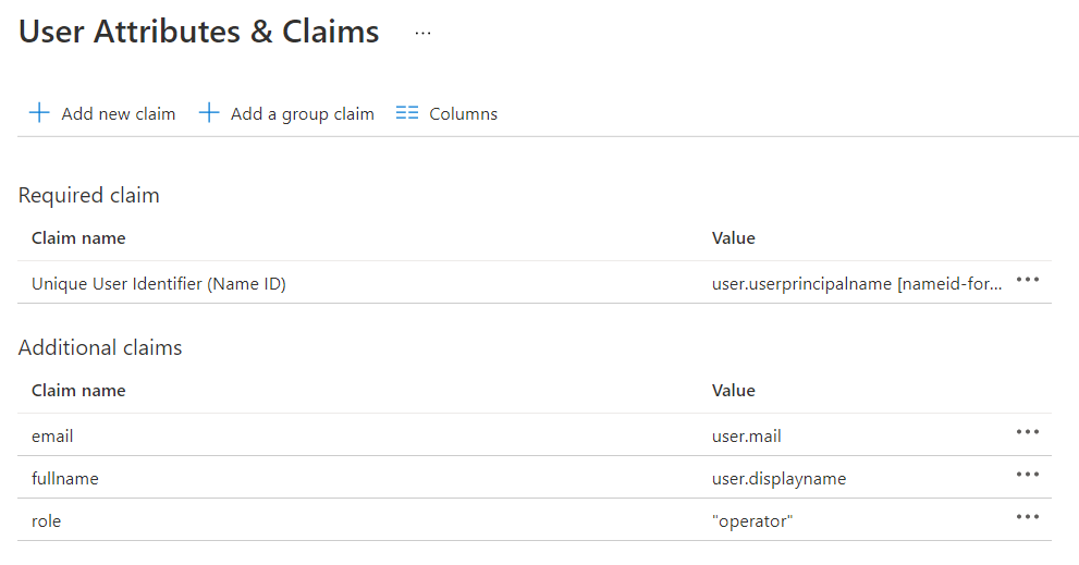 9. Next click 'Edit' in the User Attributes & Claims area. Delete the existing claims and create new claims like shown. The 'role' claim can be ignored if using on the frontend, and additional claims can be configured as per our documentation.