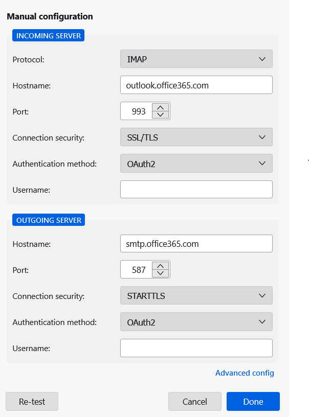 4. If Thunderbird could not find your mailbox, enter the Manual Server Information below.